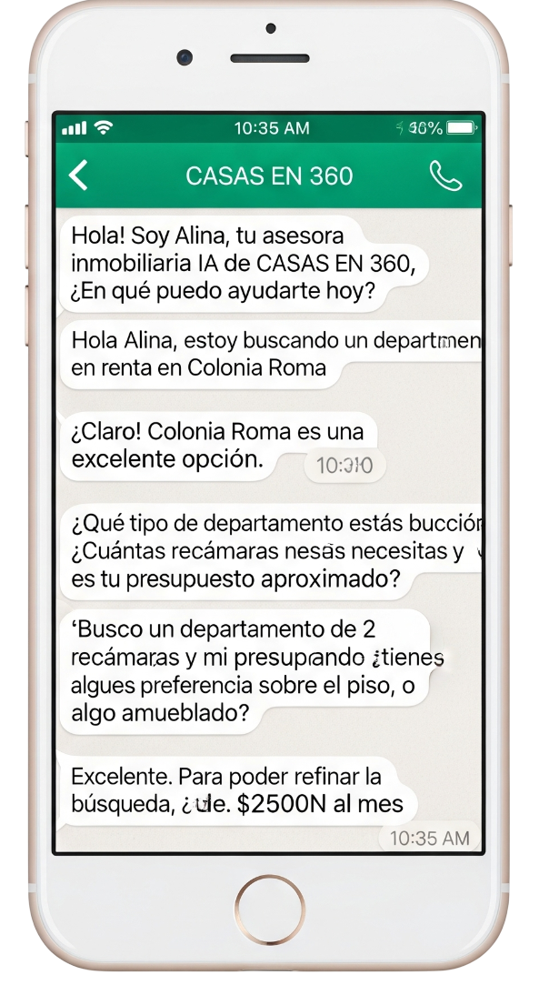 La IA de CASAS EN 360 ofrece respuestas precisas y contextuales. Entiende la intención del usuario para proporcionar información detallada sobre tus propiedades o servicios, como un experto humano.